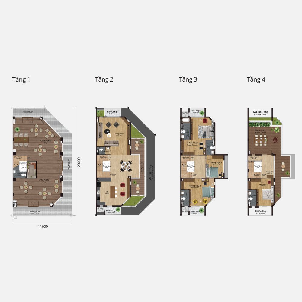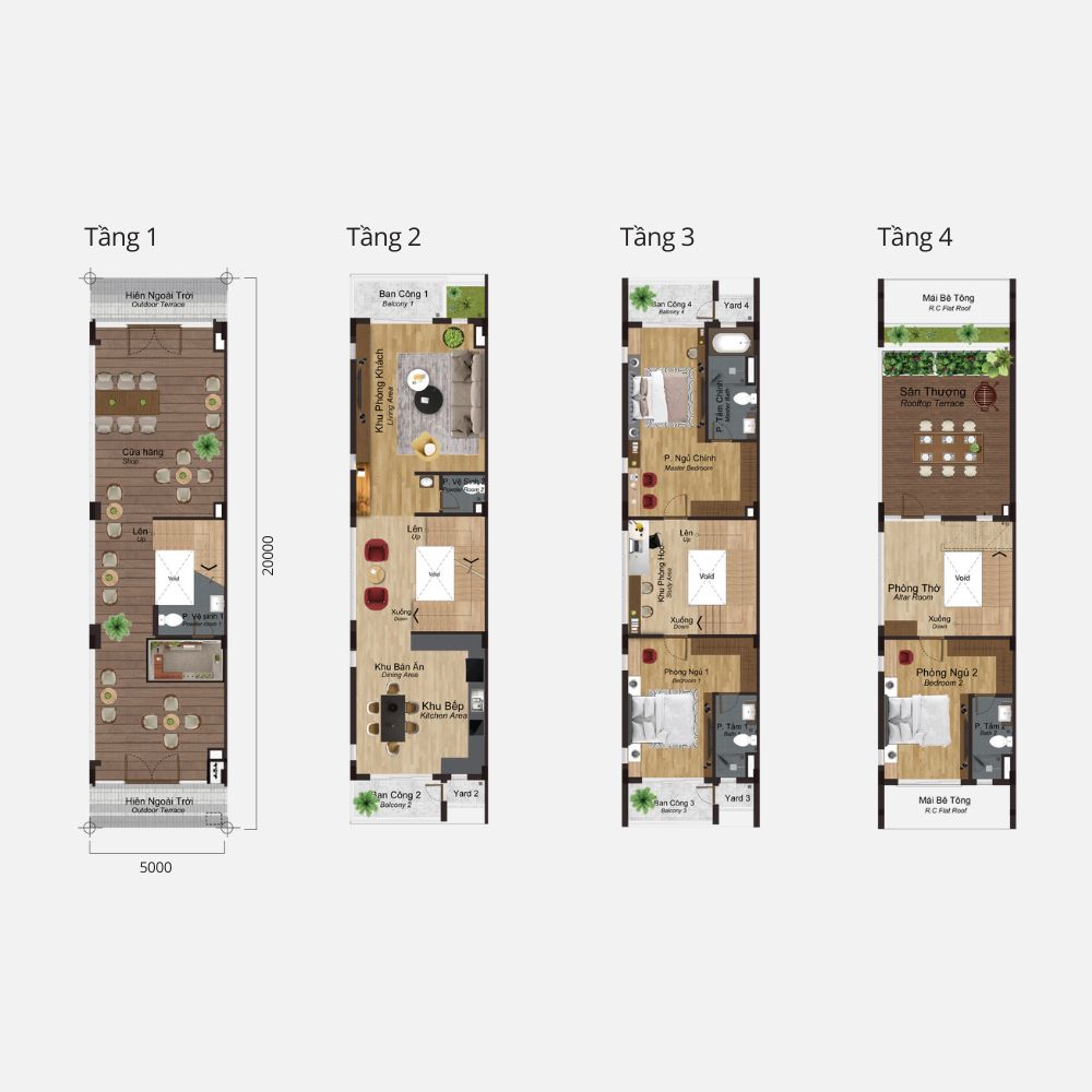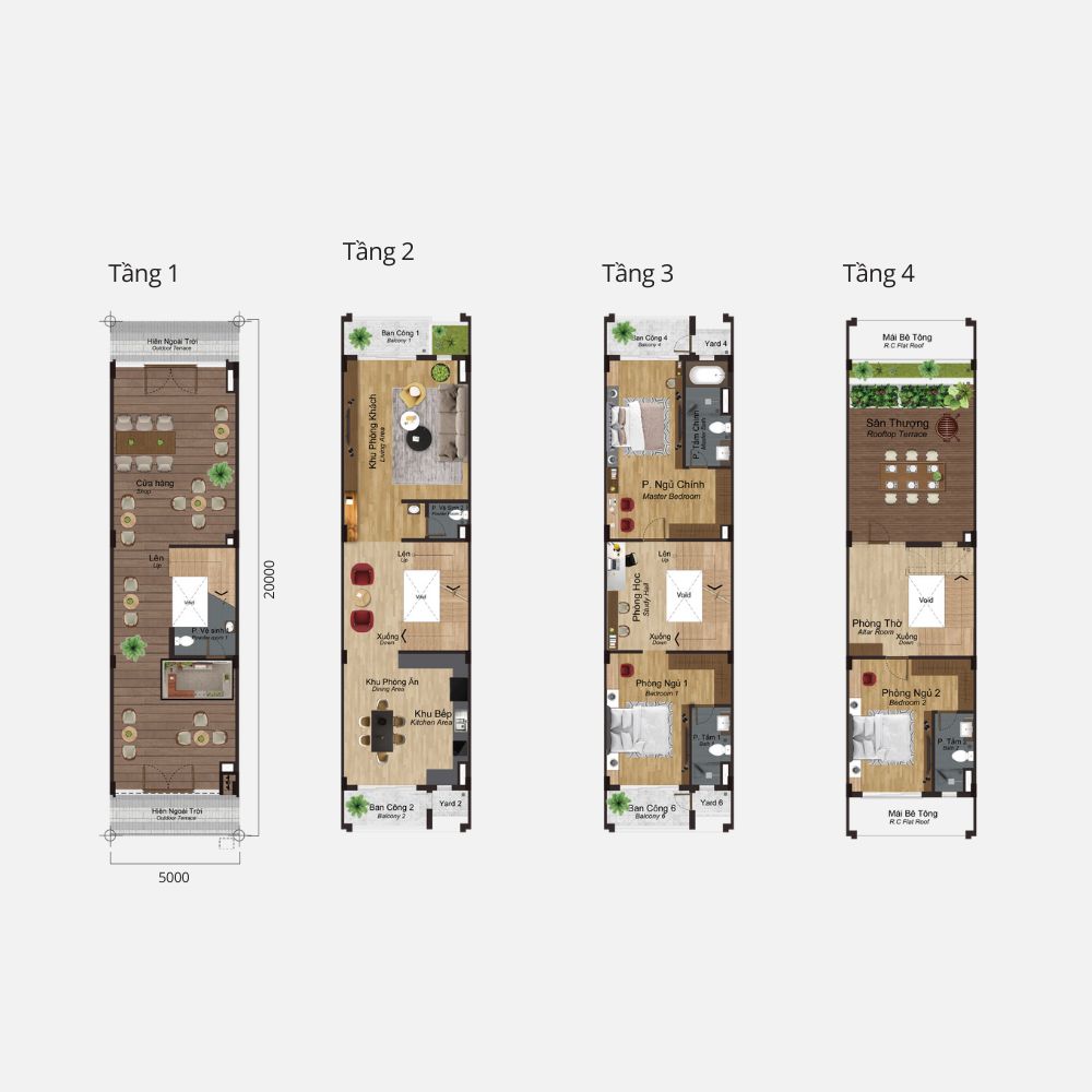 4 Tầng: 348–472 m² (3 phòng ngủ, 5 phòng tắm)