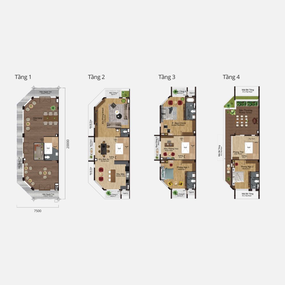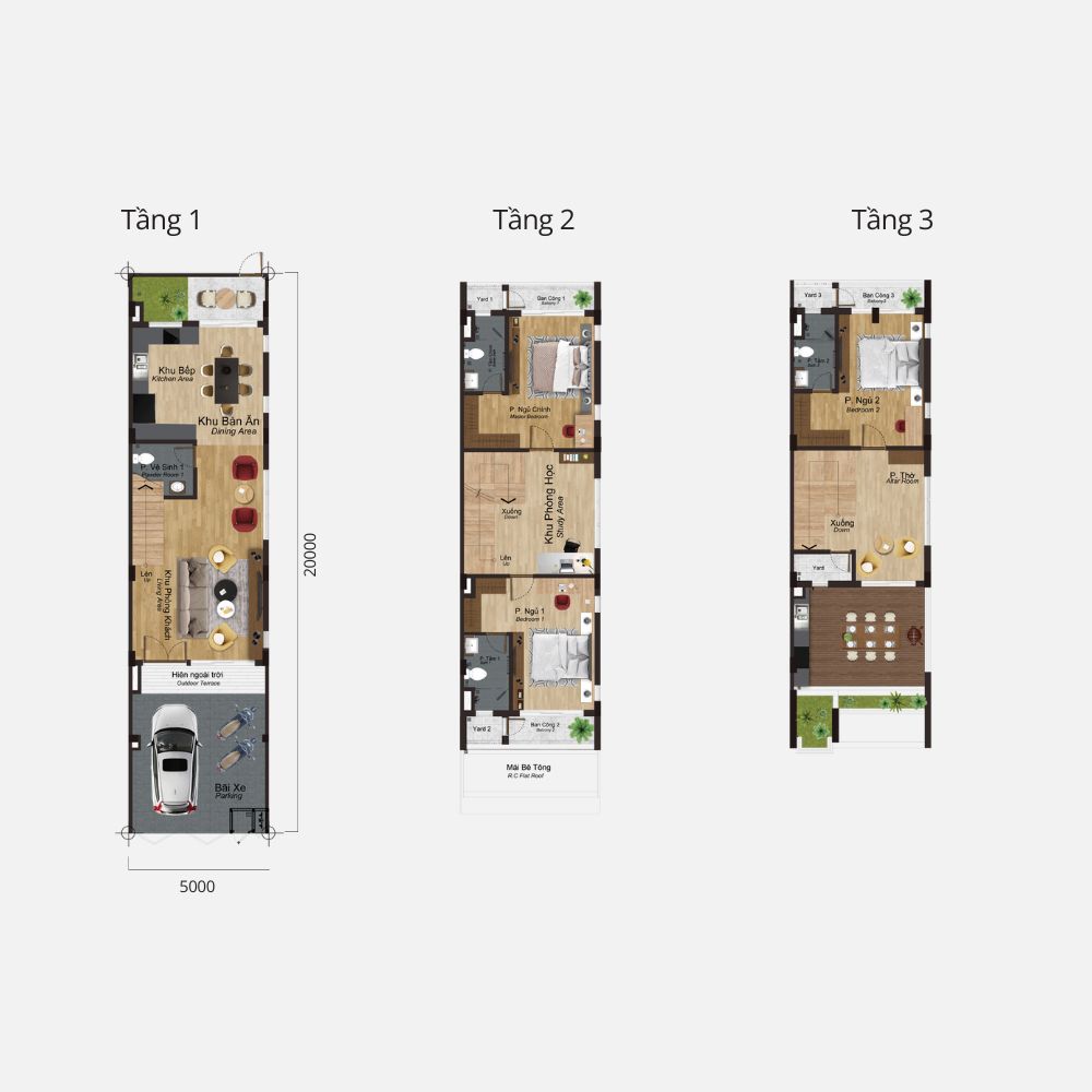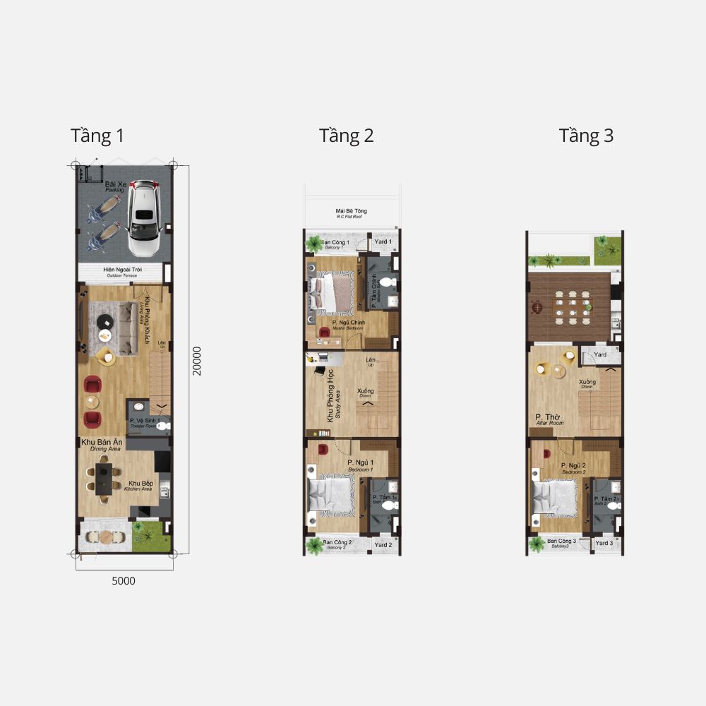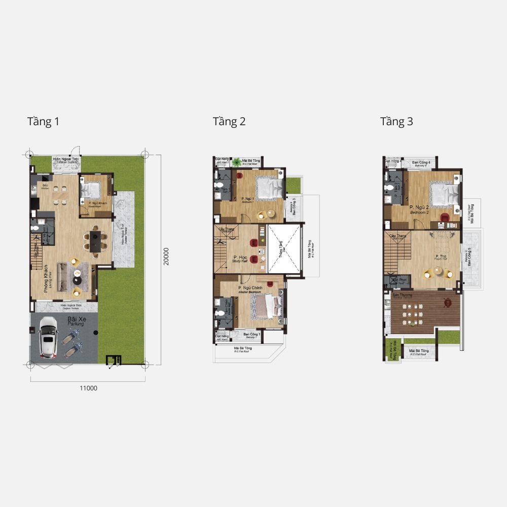 3 Tầng: 216–291 m² (3 phòng ngủ, 4 phòng tắm)